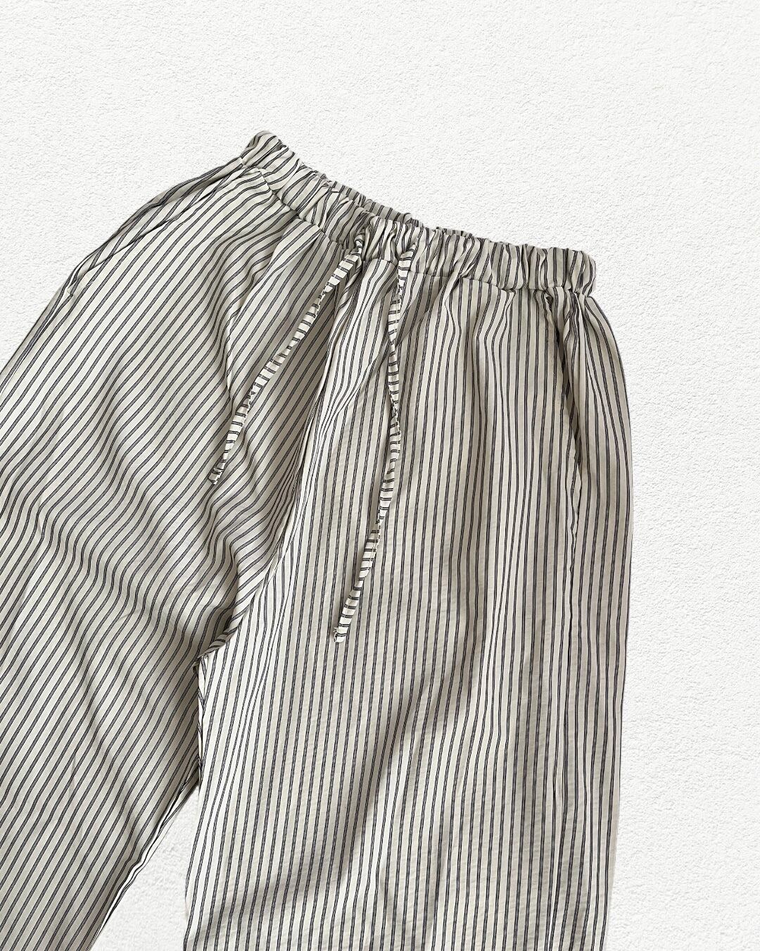 縦ラインのストライプ柄がスタイルアップを叶え、ウエストはゴム仕様&ドローストリングで着心地も抜群◎