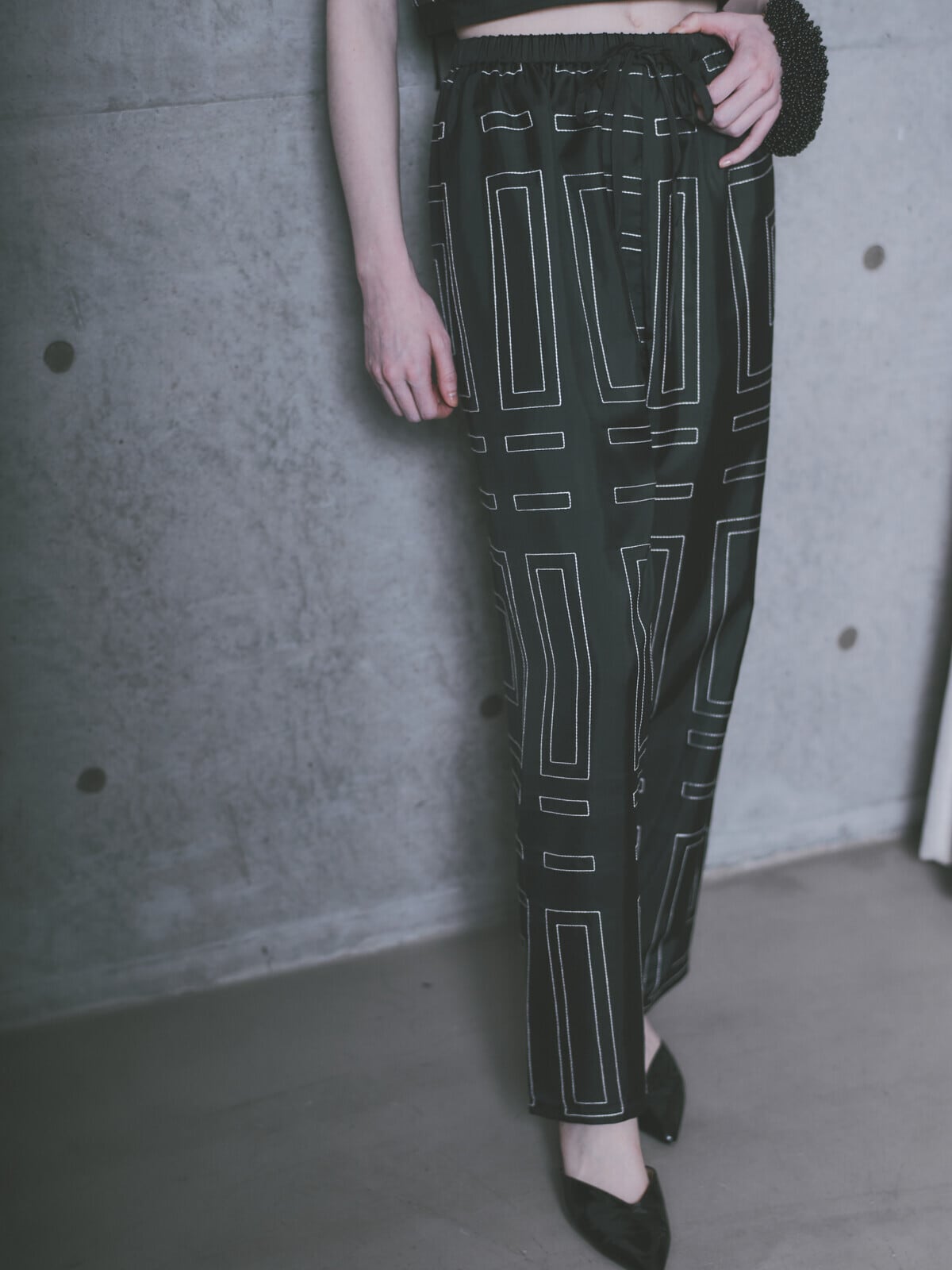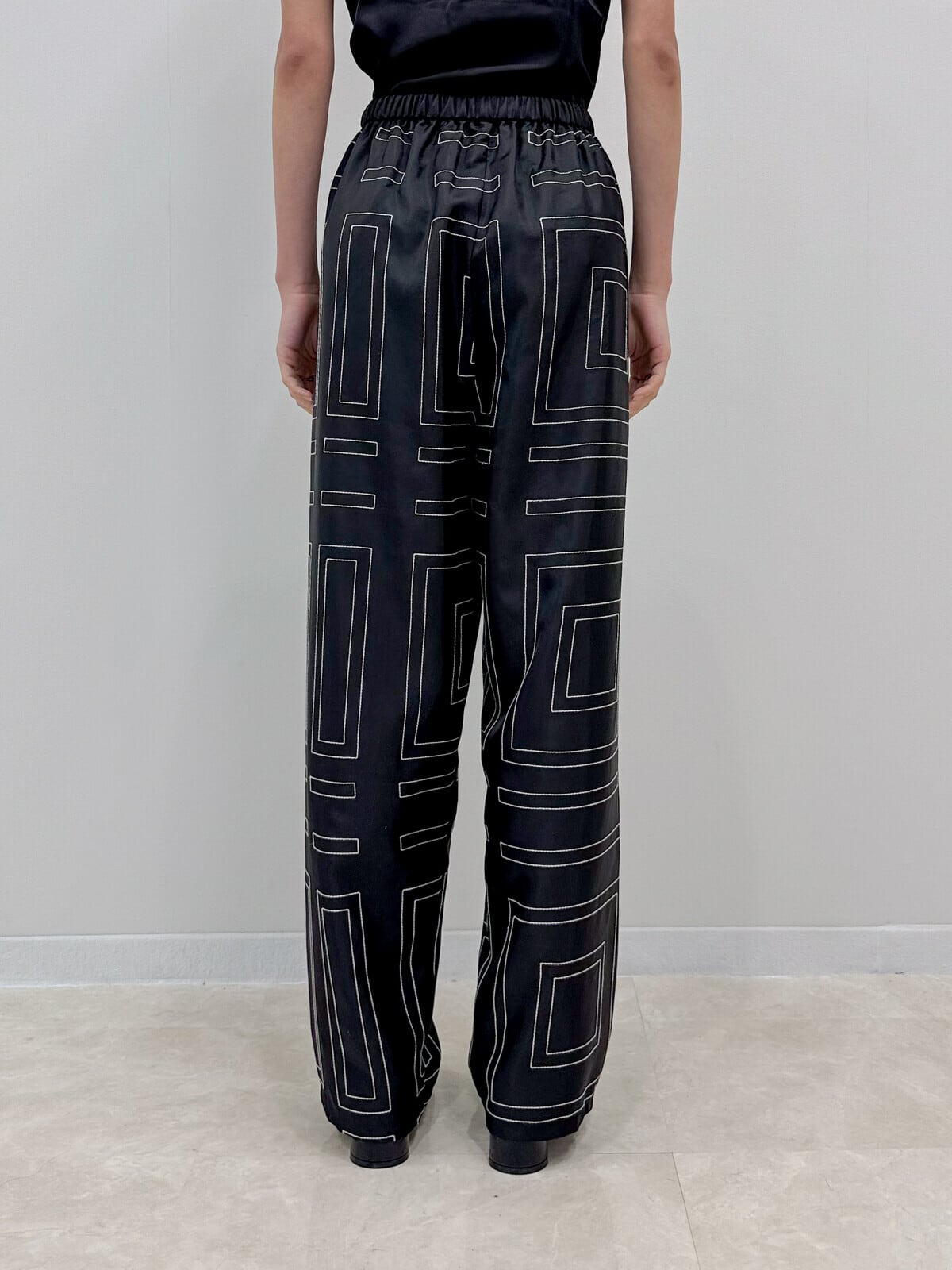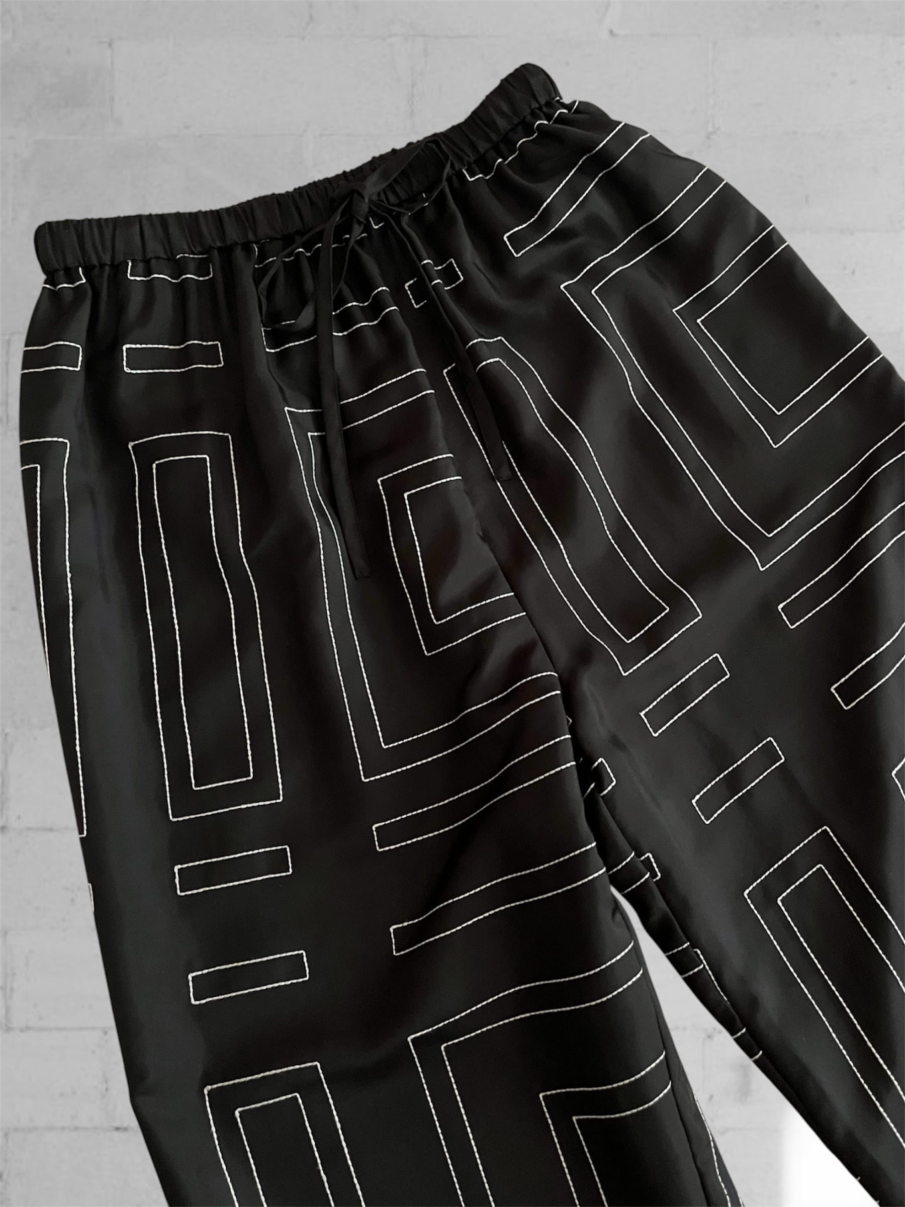 程よい光沢感のあるサテン素材に、幾何学的なライン刺繍を施したワイドパンツ。
