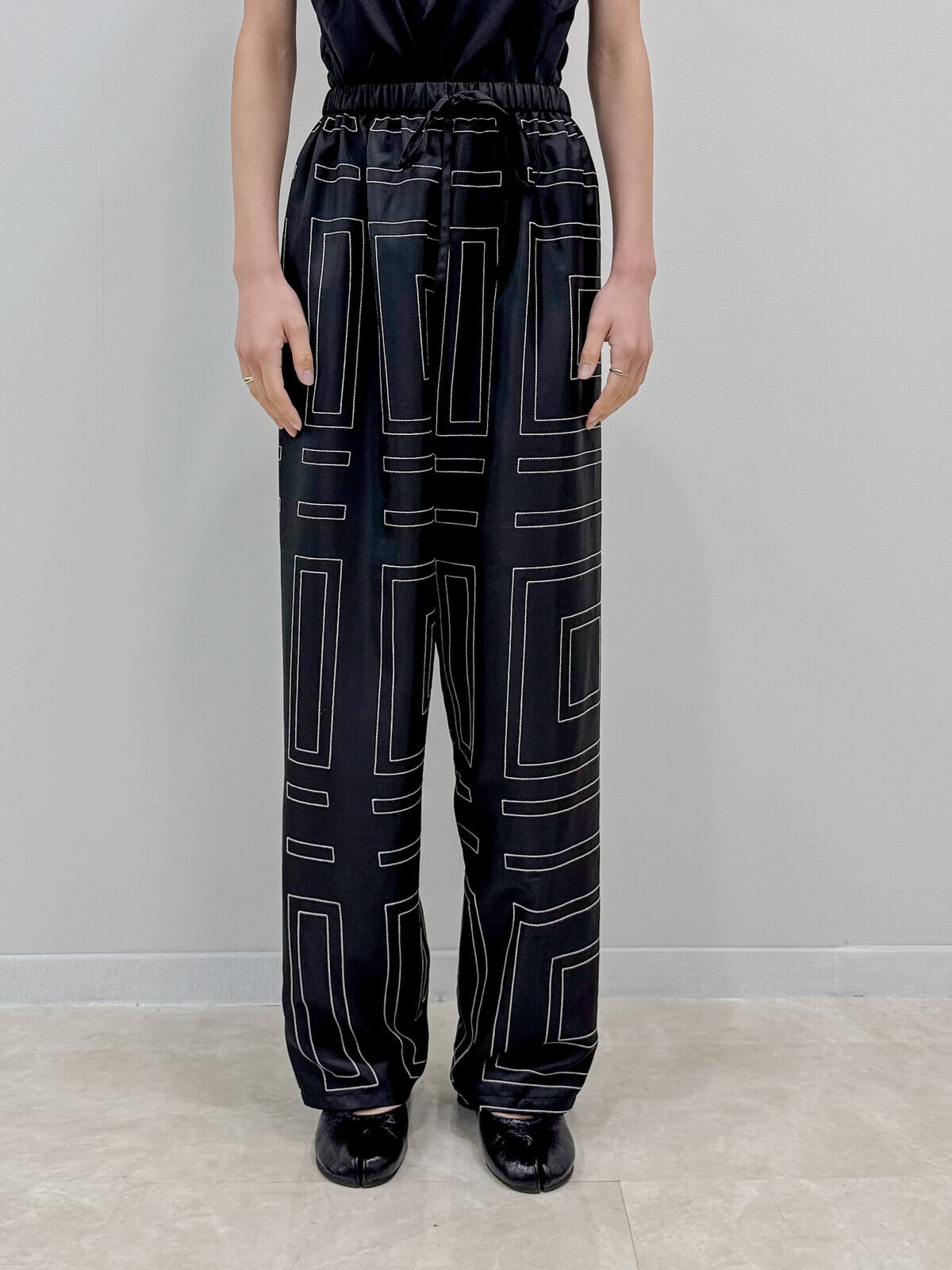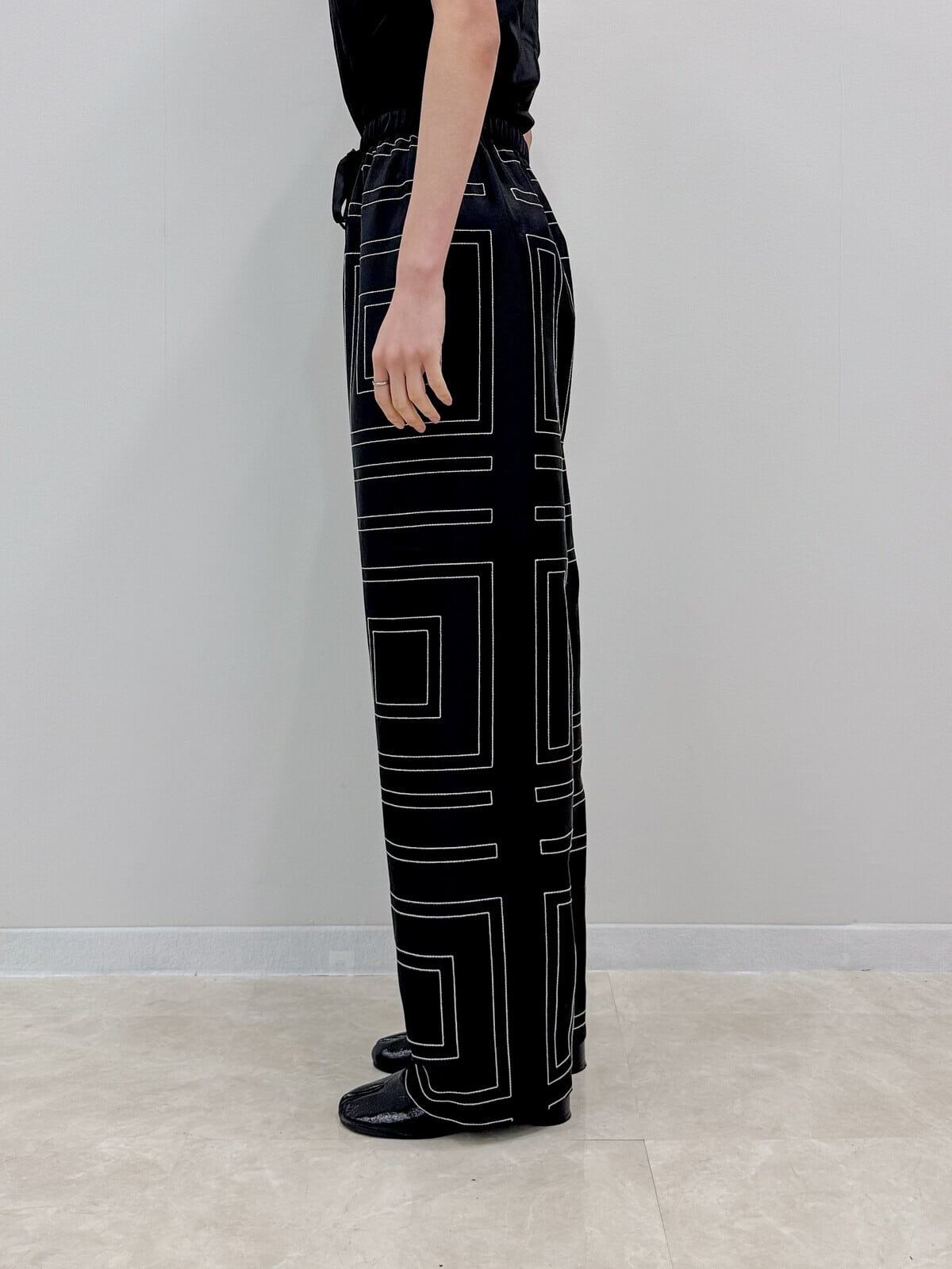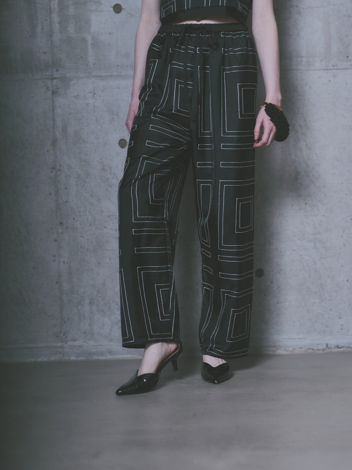 程よい光沢感のあるサテン素材に、幾何学的なライン刺繍を施したワイドパンツ。